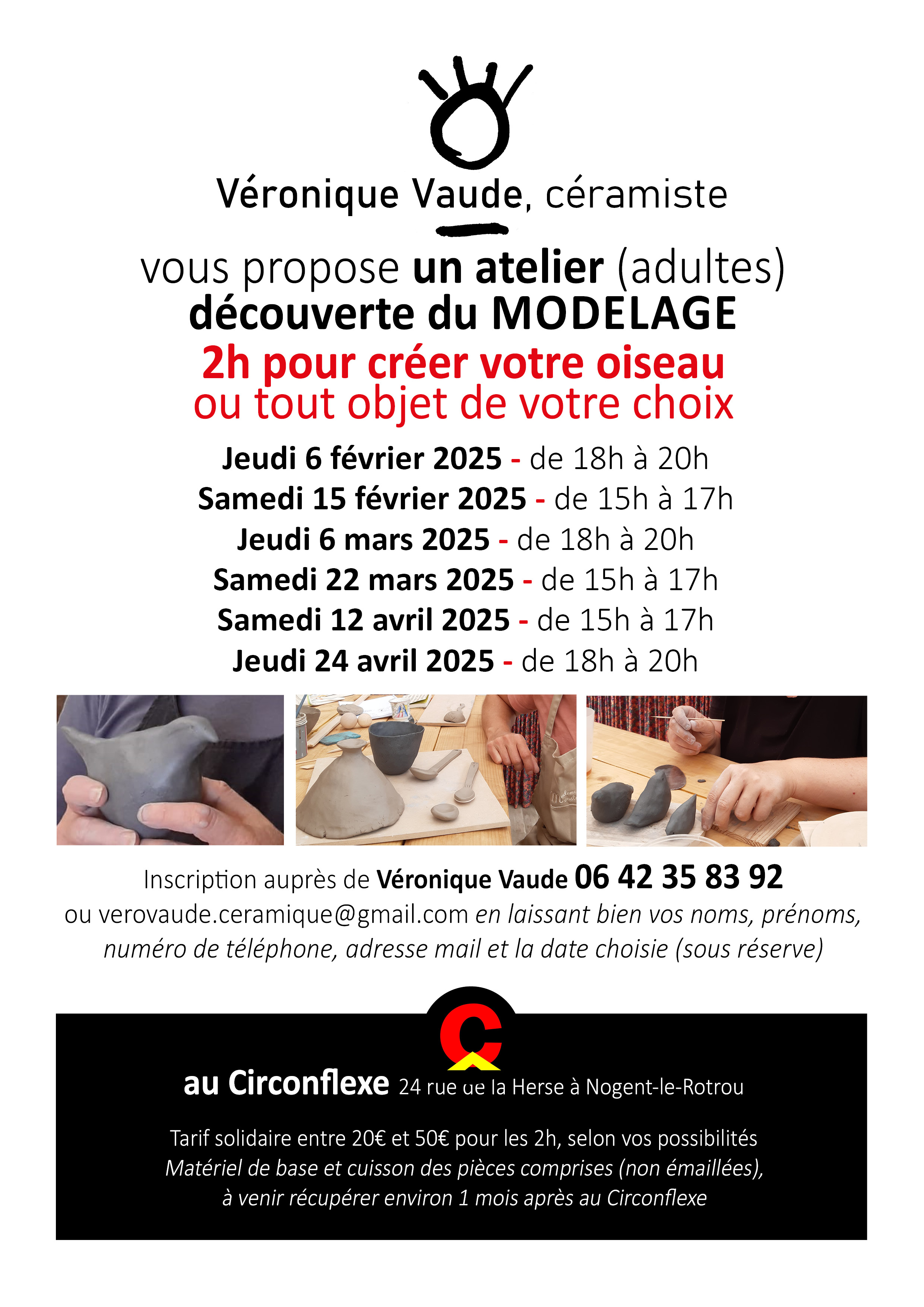 Réservation => verovaude.ceramique@gmail.com (laisser vos noms, prénoms, n° de téléphone, adresse mail et la date choisie - sous réserve de dispo)