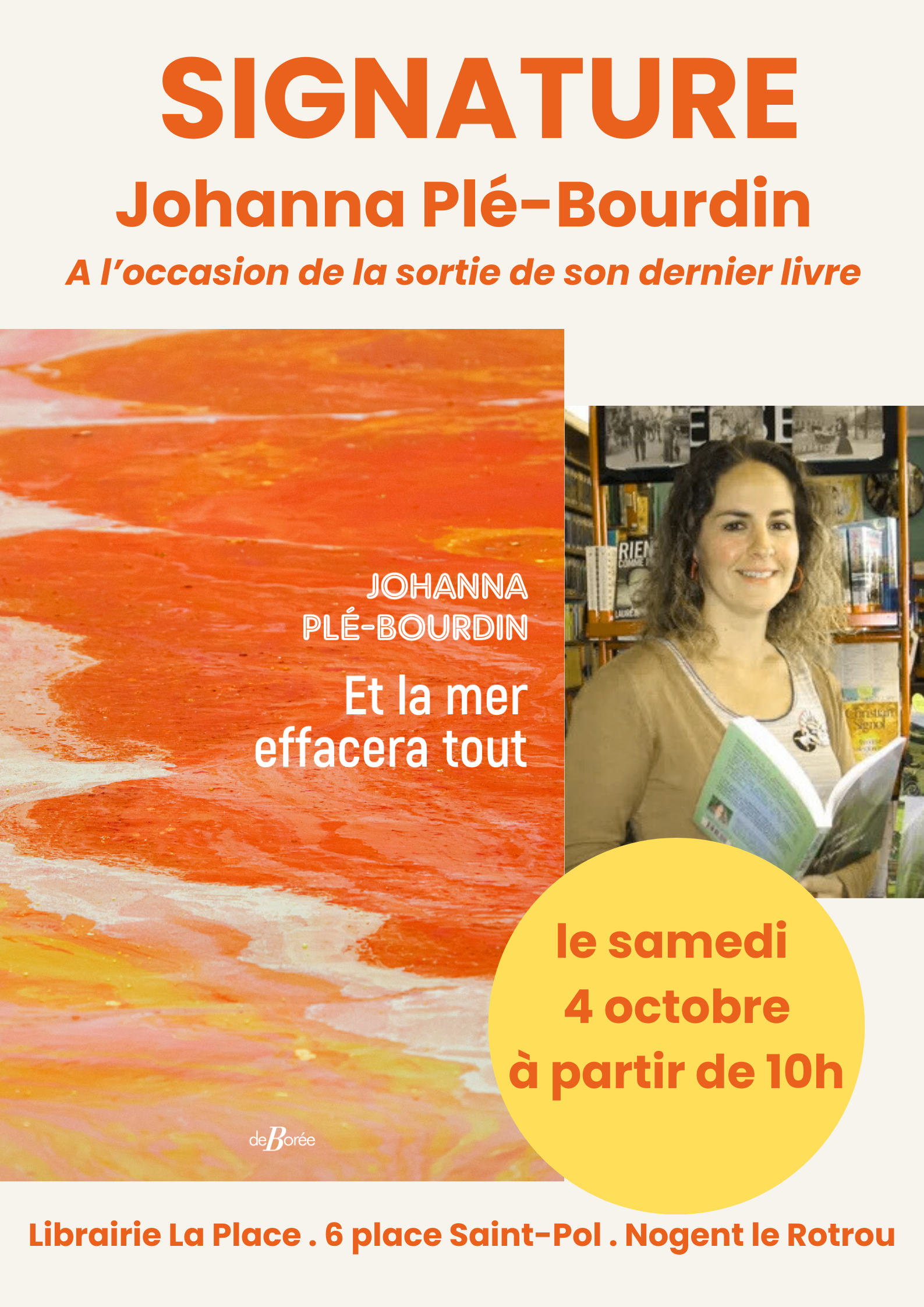 La Librairie La Place accueille Johanna Plé-Bourdin, autrice percheronne, pour une séance de dédicace. L'occasion de venir découvrir son dernier livre - Et la mer effacera tout, sorti aux éditions De Borée.